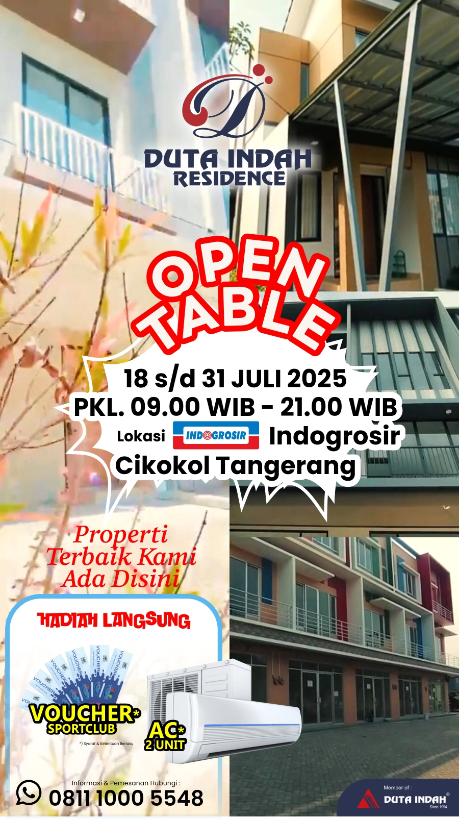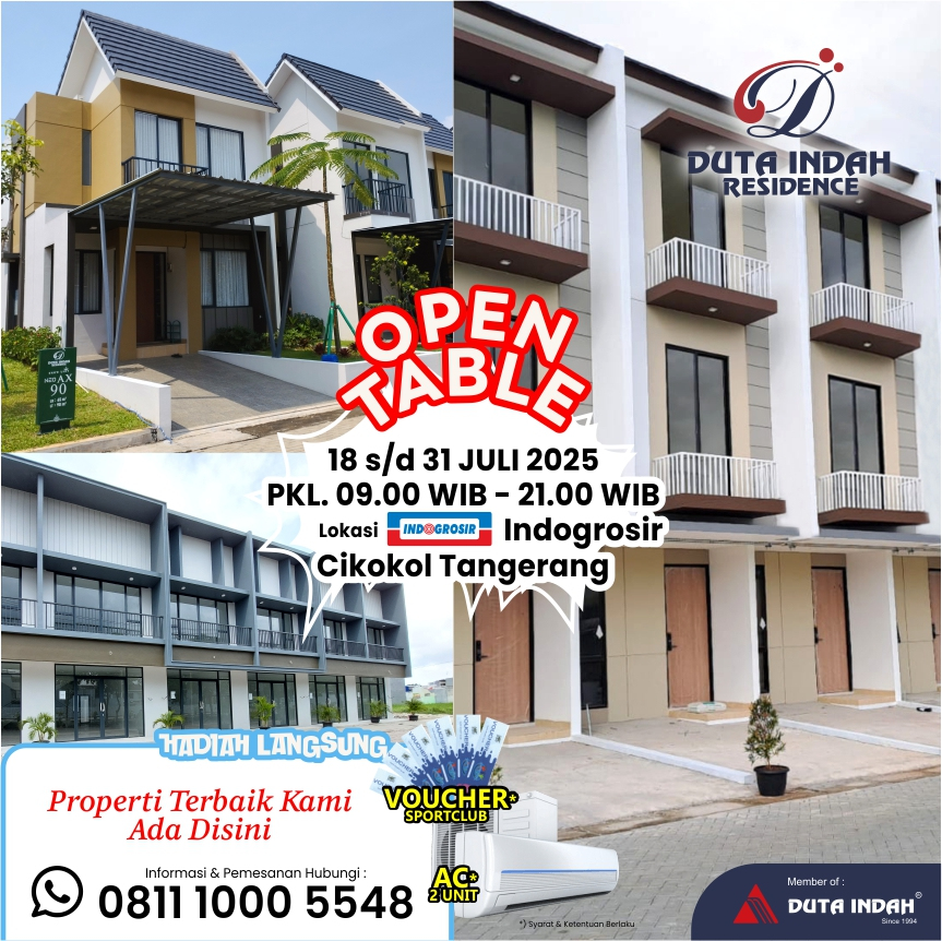 Langsung aja datang & kunjungi Booth kami “Duta Indah Residence” di acara Open Table @Indogrosir, Cikokol - Tangerang, yang diselenggarakan pada Tanggal : 18 s/d 31Juli 2025, Jam : 09.00 s/d 21.00 WIB