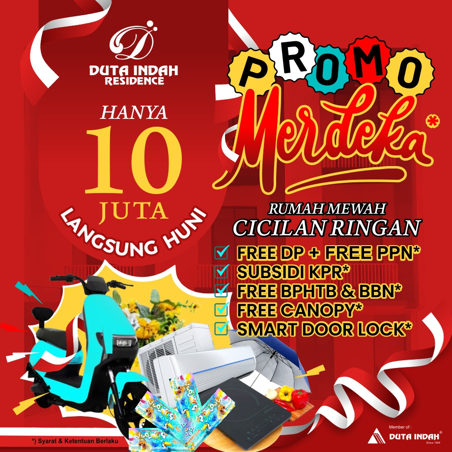 Semangat suka cita menyambut HUT RI yang ke-80 thn, Duta Indah Residence bagi-bagi 🎊🎉Promo Merdeka!!! 🎉🎊 spesial diberikan untuk setiap pembelian produk properti Duta Indah Residence.